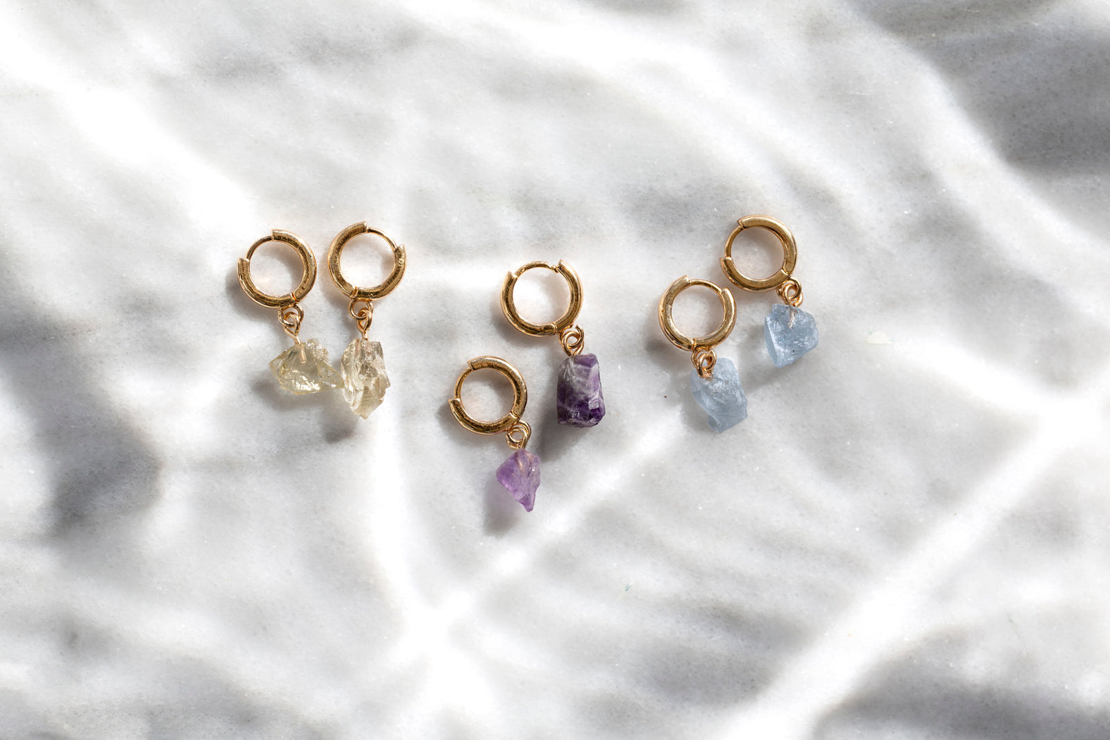 Vi har ametist, citrin, akvamarin, klar och rosékvarts samt amazonitråstenar.