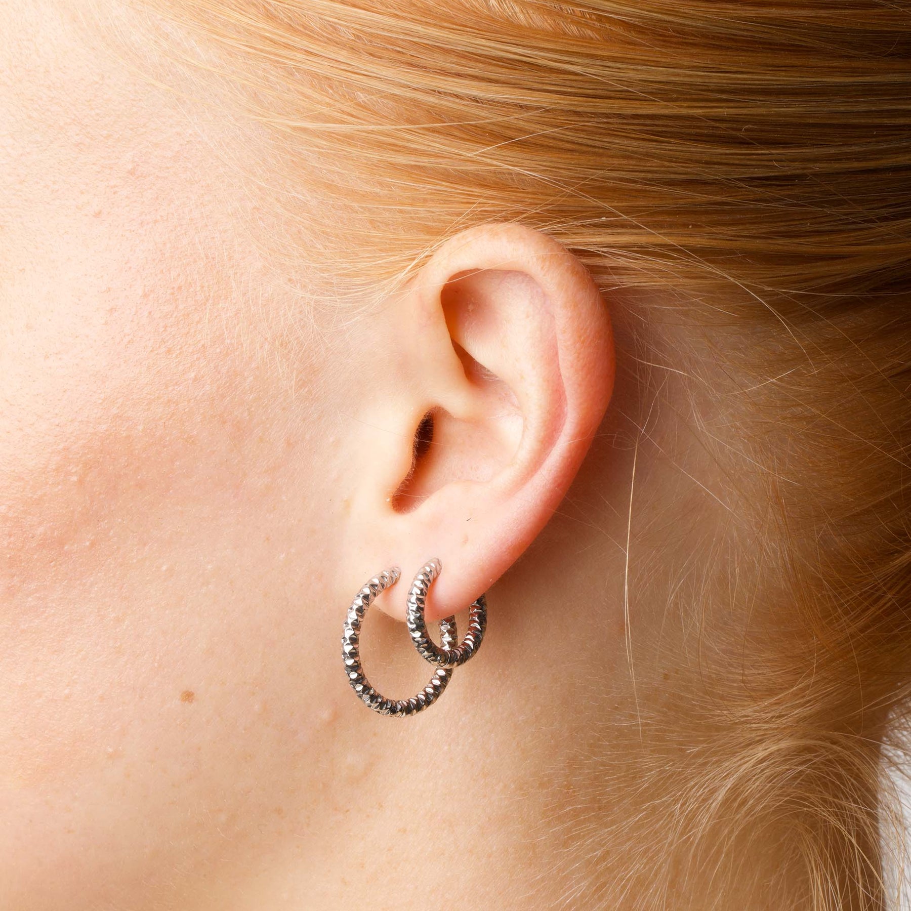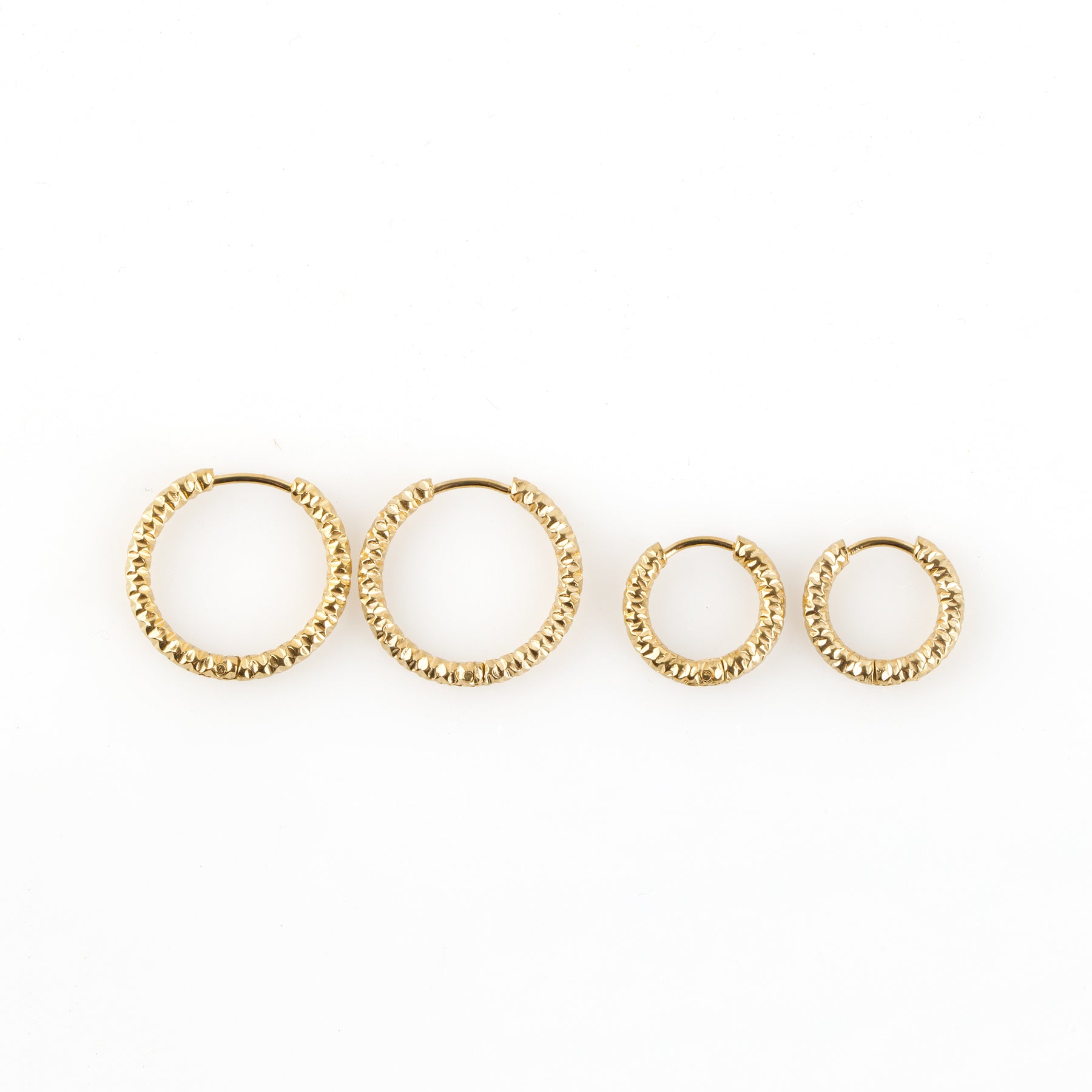 Vardagsvänliga örhängen med en strukturdesign. De här klassiska, lätta hoops örhängen i rostfritt stål är vattentåliga och missfärgningsfria för att du ska kunna bära dem utan ansträngning. Finns i silver & guld för att passa din stil och dina behov.