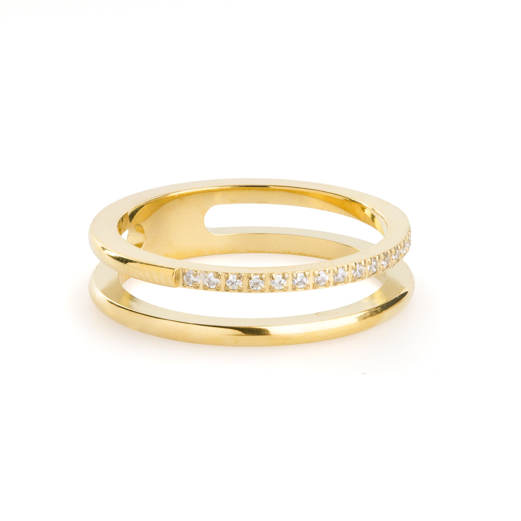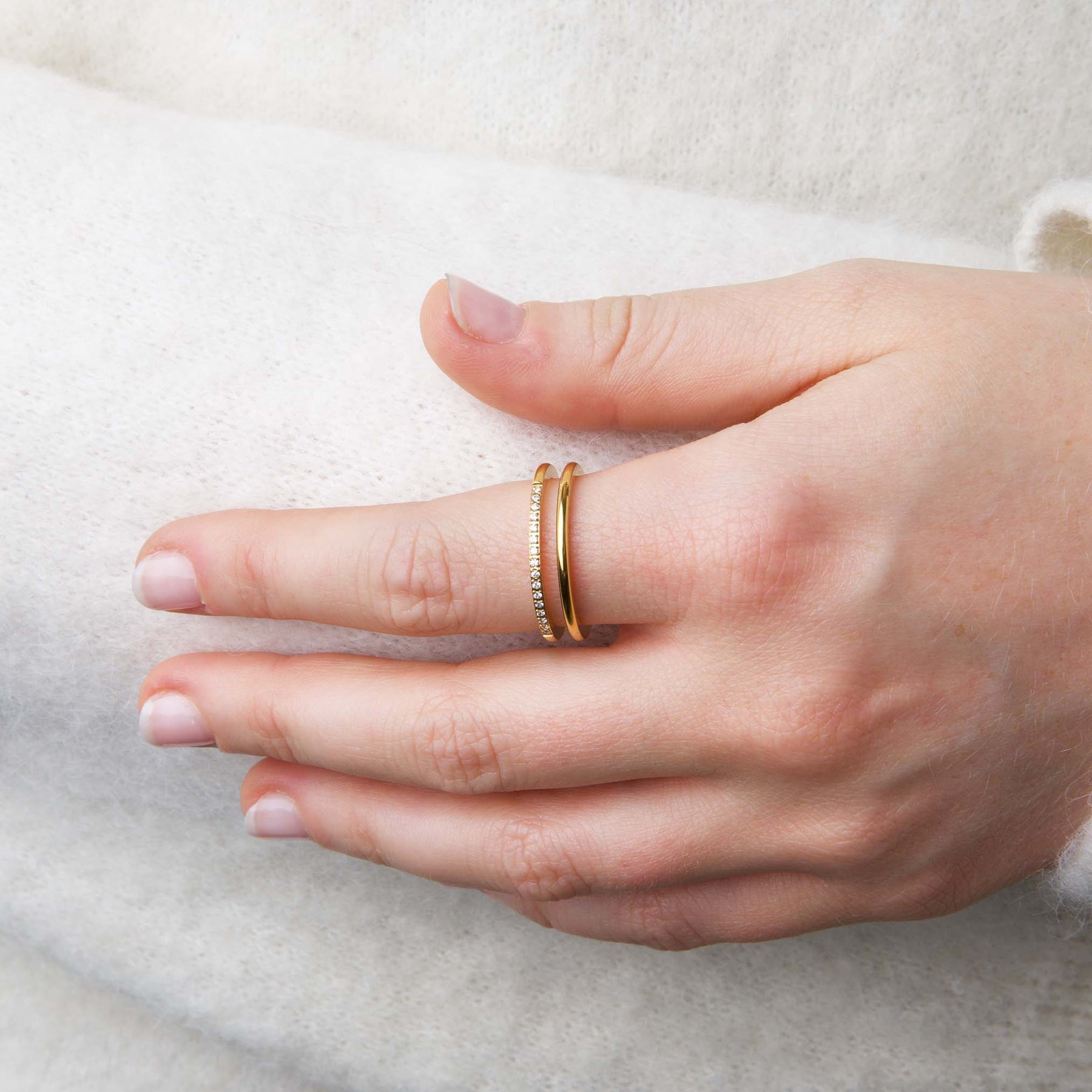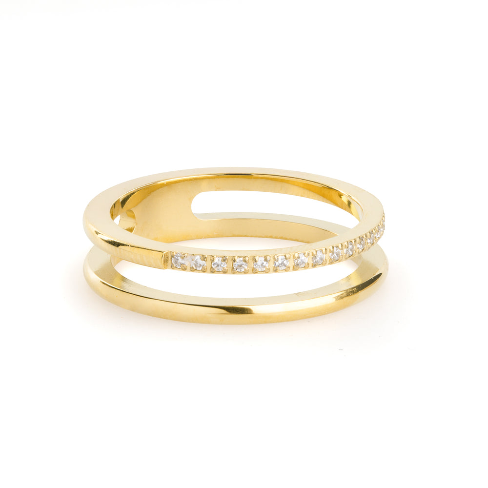 The Melissa ring is crafted in waterproof stainless steel with a sleek double-band design, accented by delicate crystals. Available in silver and 18k gold plating – modern, elegant, and easy to wear every day.